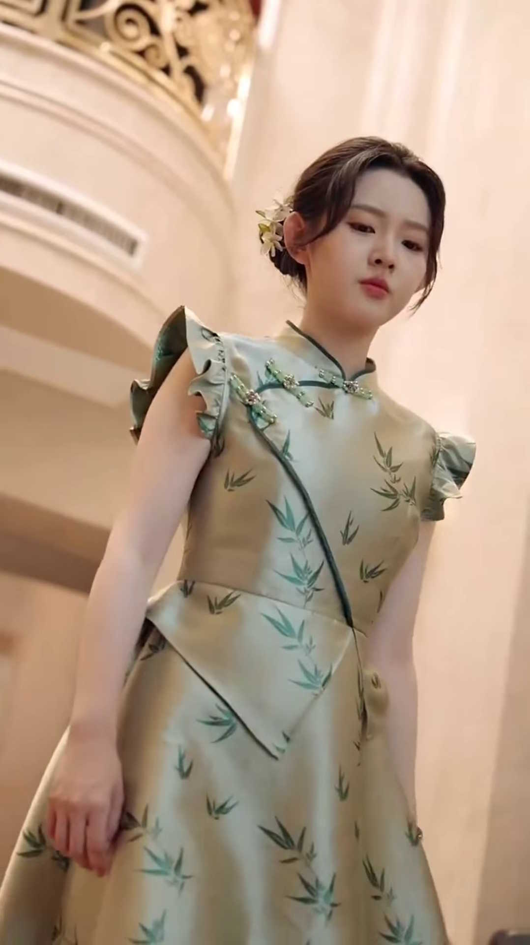 裸色长裙,裙面没有任何装饰点缀,乍一看,确实不出彩。